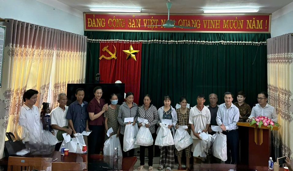 Thứ trưởng Bộ Y tế Trần Văn Thuấn và Chủ tịch Công đoàn Y tế Việt Nam Phạm Thanh Bình trao tặng quà cho 20 người dân trên địa bàn xã Quang Sơn, tỉnh Lạng Sơn bị ảnh hưởng bão lũ